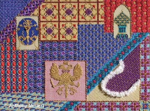 The sixth in Tony's international textile design series, Slava is based on Russian fabrics. This is truly Russian "Glory" and is another phenomenal cultural medley of textiles, architecture, symbols, and artwork from the majesty of imperial Russian. The finished piece includes a representation of Catherine the great's inaugural robe, the imperial Romanov Double Eagle, an onion dome from a cathedral, and a Faberge egg. The piece is stitched on 24-count Congress cloth using silks, metallic threads, and beads.