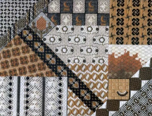As the fifth of Tony's international textile designs, Out of Africa is based on the fantastic African batik and mud cloth patterns from Angola, Nigeria, Ghana, Namibia, Botswana, Sierra Leone, Ethiopia, Senegal, Tanzania, Cameroon, Zimbabwe, and Zambia. Beads, silk and metallic threads are used and are stitched on 24-count Congress cloth.