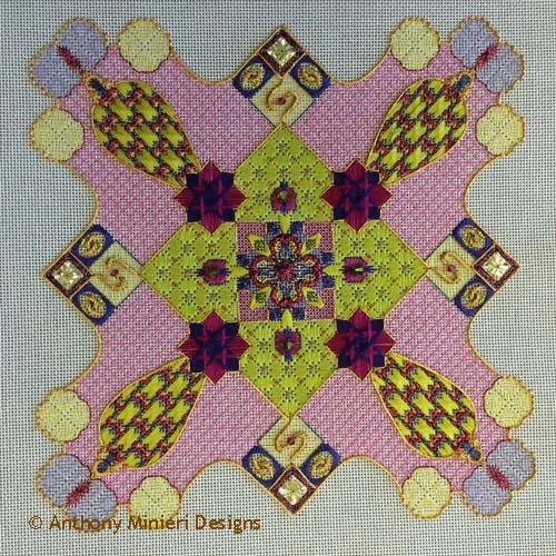 This design, inspired by architectural details from the Taj Mahal, is a geometric etude worked in fuchsia, blue violet, acid green, and Japan gold. The design teaches complex multi-step flat patterns, crescents, Swarovski flat backed sequin attachment, bead attachment, light stitching for minimum coverage, tied sheaves, Bokhara couching, and other stitches and techniques. You will work with stranded silk, metallic braids, Petite Silk Lame’ Braid, Impressions solid, seed beads, and 10MM flat backed Swarovski square sequins.